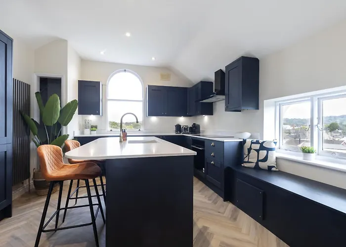 Een ingerichte kitchenette beschikt over alle voorzieningen, inclusief een oven en een vaatwasser. Cheltenham Spa treinstation is afstand ervandaan en Bournside Drive bushalte in de nabijheid van Stunning 4 Bedroom Top Floor Apartment Close to Cheltenham.